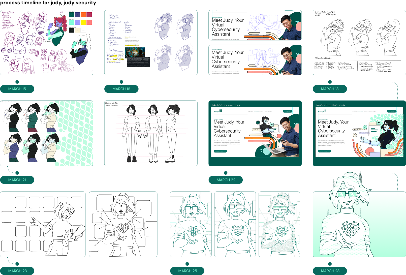 When I started on this Judy “mascot” project, there were many, many constraints to keep in mind: We had less than two weeks to develop a mascot for Judy Security (Formerly Aadya security), we had many features and details we had to keep in mind, and we needed to make sure her design was scalable. This character was designed and developed in about a week, with another week to fine tune details and get initial collateral out. She was a big hit with the Aadya team, and so I designed three more poses for Judy, and developed a design bible for us to quickly and efficiently make more Judy poses.