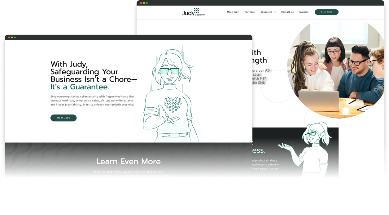 Judy Security is an AI-driven, enterprise-grade platform that’s affordable, intuitive, and specially designed to align with MSP business models and the unique needs of the SMB market. Judy, the mascot, was almost instantly very popular, and we were featuring her on every kind of collateral we could. Eventually, Judy became so central to the Aadya brand that they renamed themselves to ‘Judy Security’.