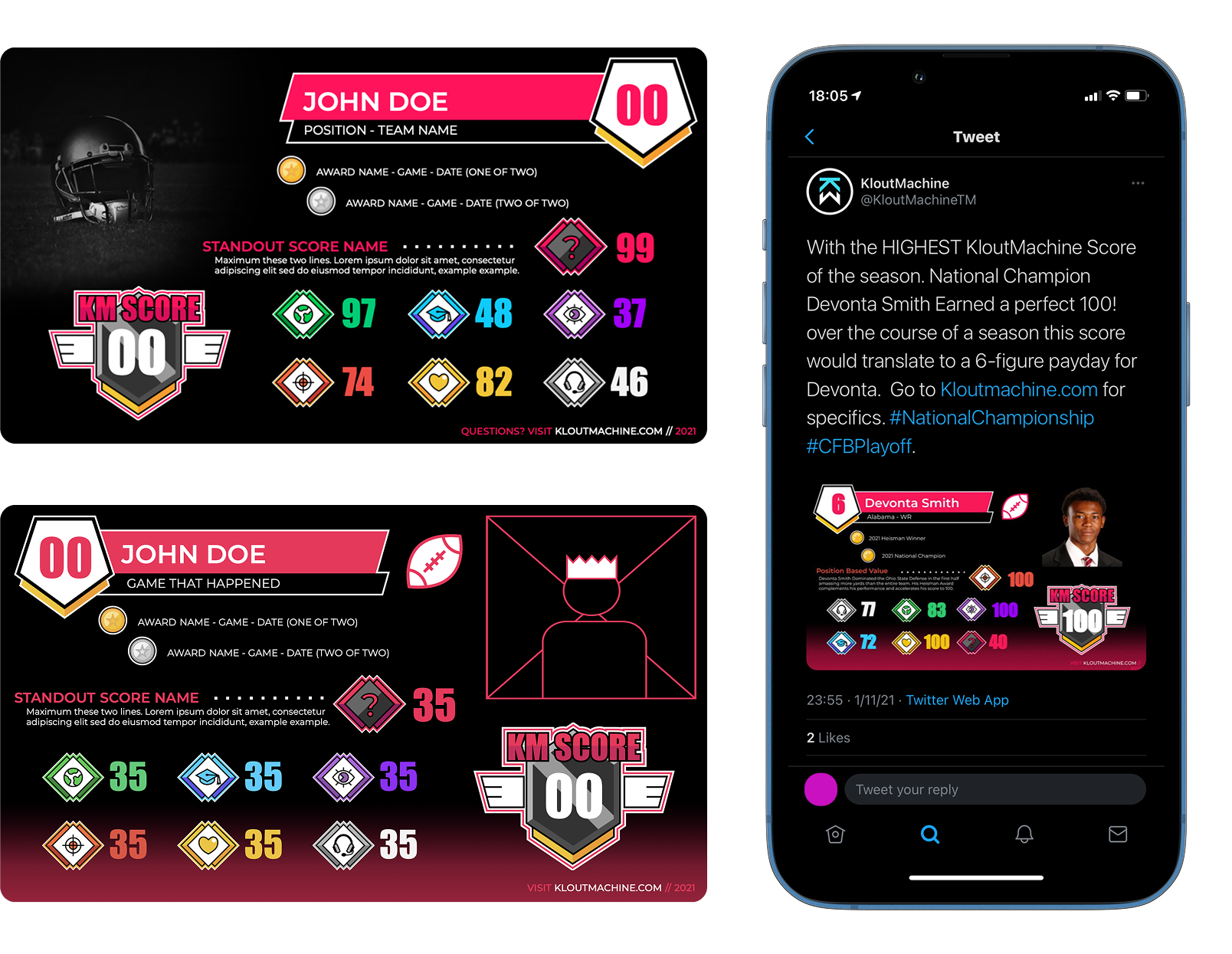 Kloutmachine’s primary method for drumming up interest in athletes joining and making a profile on KM was through these scorecards. Using their KM’s propreitary information, KM could caluclate a student athlete’s score based on their metrics, their location, their education, and their post game interview. These scorecards needed to be fast to fill in, fast to execute, and feel like a little like a trading card. Due to KM being pre-seed, I made these in google slides so that KM’s owners could quickly, easily, and cost effectively make these scorecards.