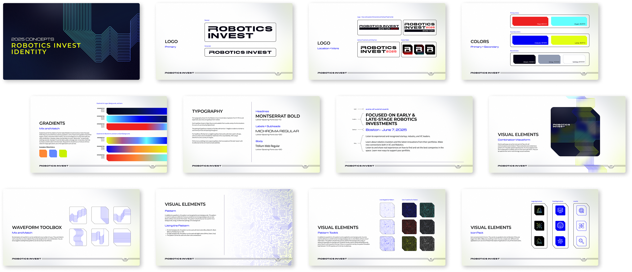 The branding for Robotics Invest includes a custom logotype I made to go with a brand identify that felt futuristic, scalable, and most of all flexible, so as to put the knowledge shared at the event at the forefront without being overwhelming. The identity includes a custom scalable “waveform” toolbox, icons, a pattern, and built-in gradient treatments to allow the brand to be as agile as needed.